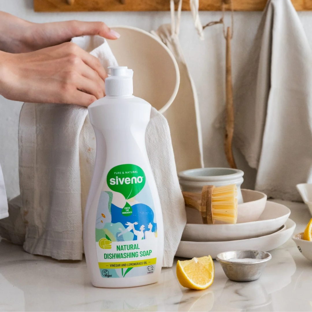 Natuurlijk Afwasmiddel van Siveno profiteert van het reinigende karakter van azijn en carbonaat. Ook reinigt dit product uw vaat met zijn speciale ingrediënten zonder uw handen te beschadigen. Dit natuurlijk afwasmiddel van Siveno is vrij van chemicaliën en bevat geen fosfaten, synthetische geur- en kleurstoffen, SLS/SLES, parabenen, alcohol, paraffine of siliconen.